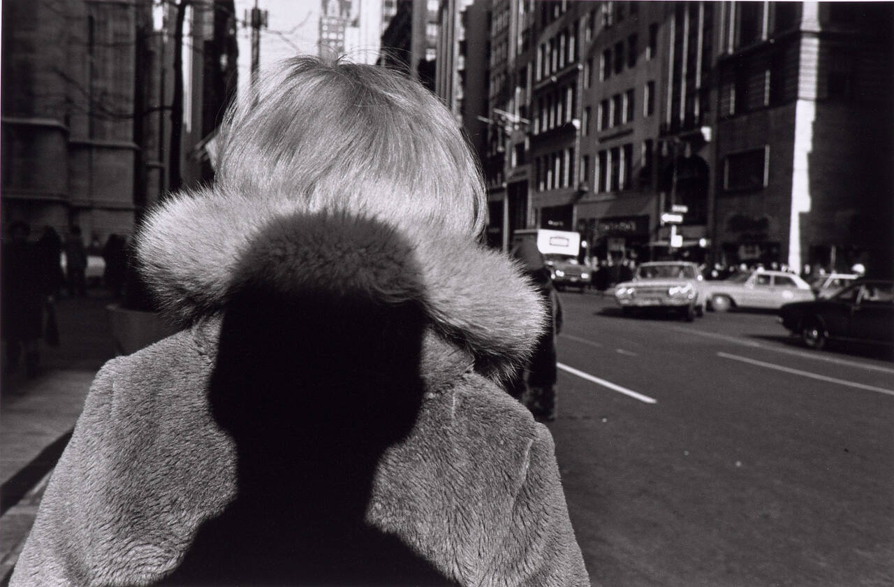 DescriptionImage of the back of woman's head with the shadow of man's head on her coat. She's walking down a sidewalk flanked with tall buildings.Gallery Label“I was finding myself at times in the landscape of my photography. I might call myself an intruder.”