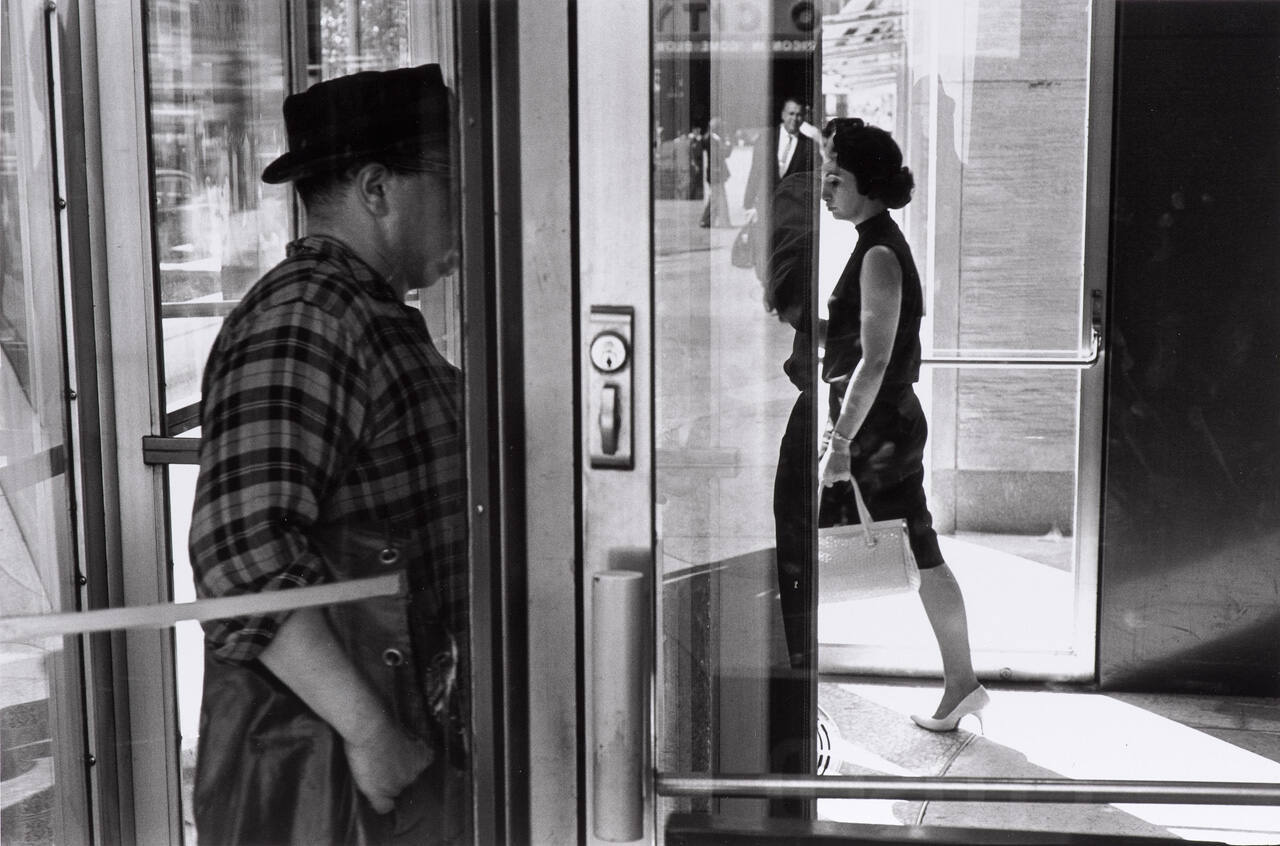 DescriptionImage of a man and a woman, in profile, entering and exiting through the glass doors of a building.ProvenanceFraenkel Gallery, San Francisco, CA;