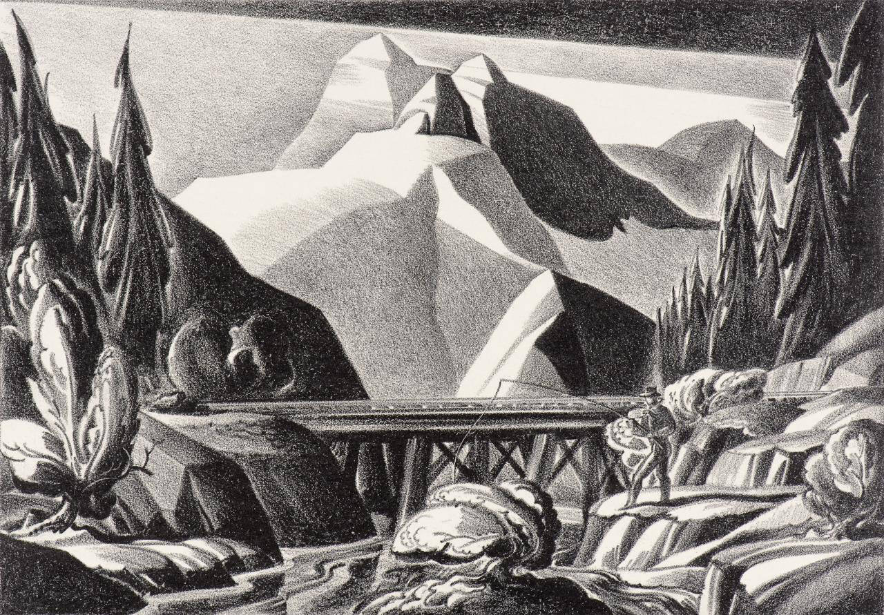 DescriptionMan wearing hat, holding fishing pole and reeling in a large fish, in front of a bridge (center of print) with mountains and pine trees lining both edges and background.Copyright© Estate of Dale William Nichols