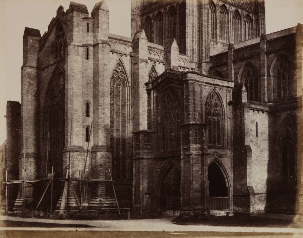 DescriptionImage of a cathedral facade with scaffolding. Top of cathedeal is outside of frame.Gallery LabelColonel Alfred Capel-Cure was among the first gentlemen-amateurs to practice photography in England. He specialized in architectural views, with an interest in medieval structures such as this one, and travelled throughout England, Wales, Scotland, and France. In this photograph of Hereford Cathedral, located in southwest England, Capel-Cure adeptly renders the delicate play of light and shadow as it illuminates the form and structure of the cathedral’s stone exterior.