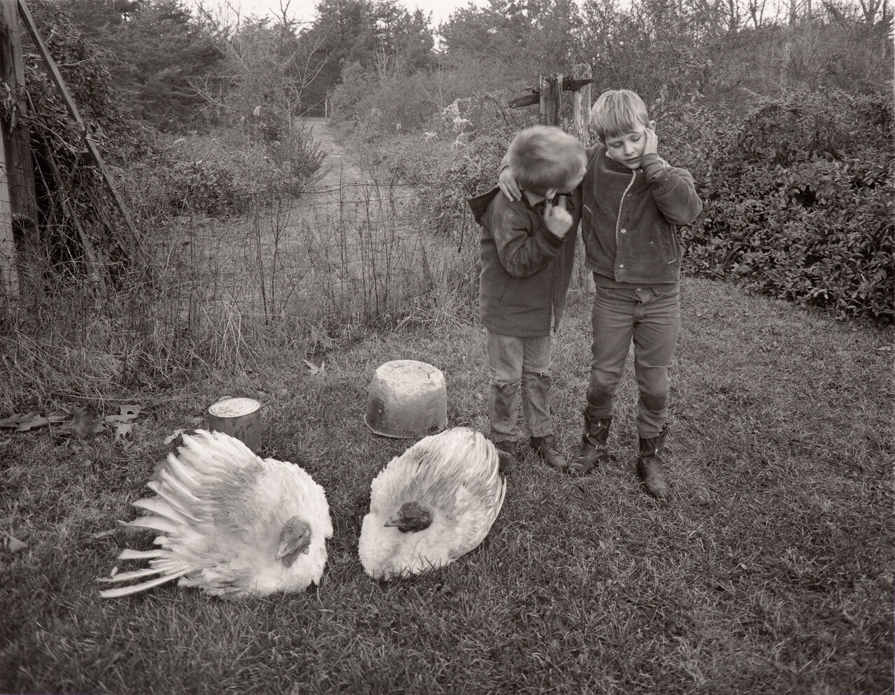 DescriptionImage of two young boys wearing coats standing next to two turkeys in the grass. A wire fence with wooden posts separates them from a path lined with foliage.Gallery LabelTwo boys, standing next to two turkeys and two pots, appear to share a playful secret. Emmet Gowin earned recognition in the early 1970s for family photographs of his wife, Edith, and her family in Danville, Virginia. Inspired by the simplicity of the amateur snapshot, these photographs transform details of everyday life into gentle mysteries.