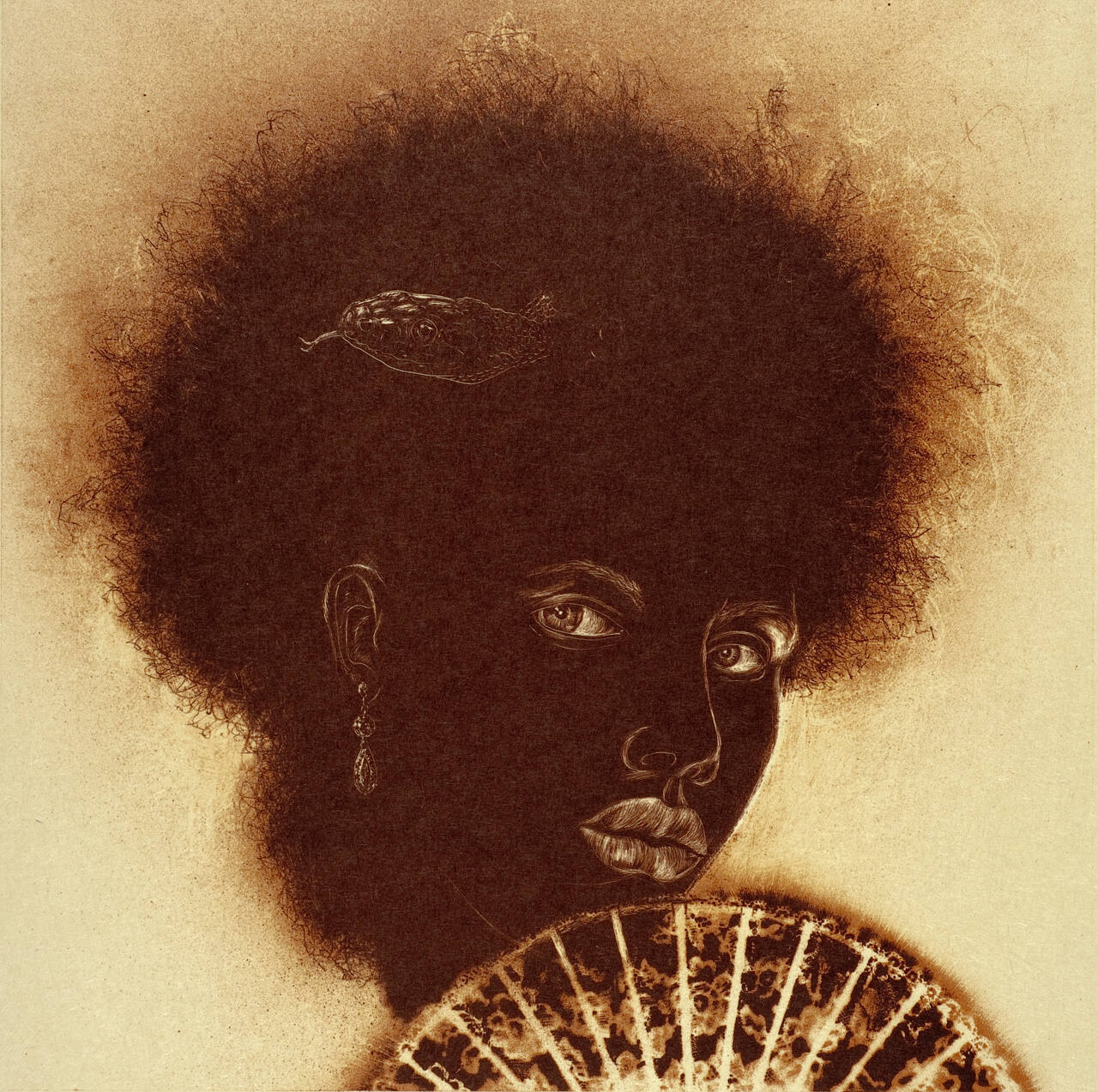 DescriptionPortrait of African American woman with fan, earrings and snake coming out of her hair, Marie Laveau was known for her connection to voodoo during the 1700/1800s.Copyright© Renee Stout