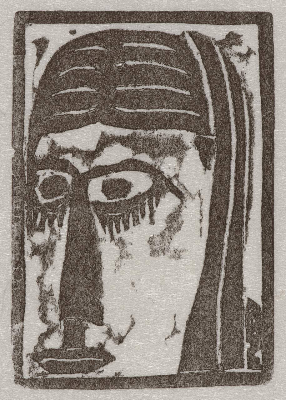DescriptionHead facing off to left with stylized hair top and lips at bottom
