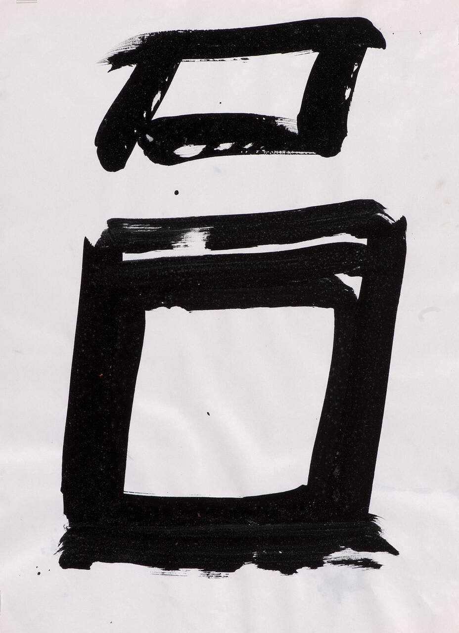 DescriptionWork consists of two black rectangular, box-like shapes stacked one on top of the other. The smaller shape is on the top. Both appear to be rendered with painterly and linear brushstrokes.Copyright© Sam Francis Foundation, California / Artists Rights Society (ARS), New York