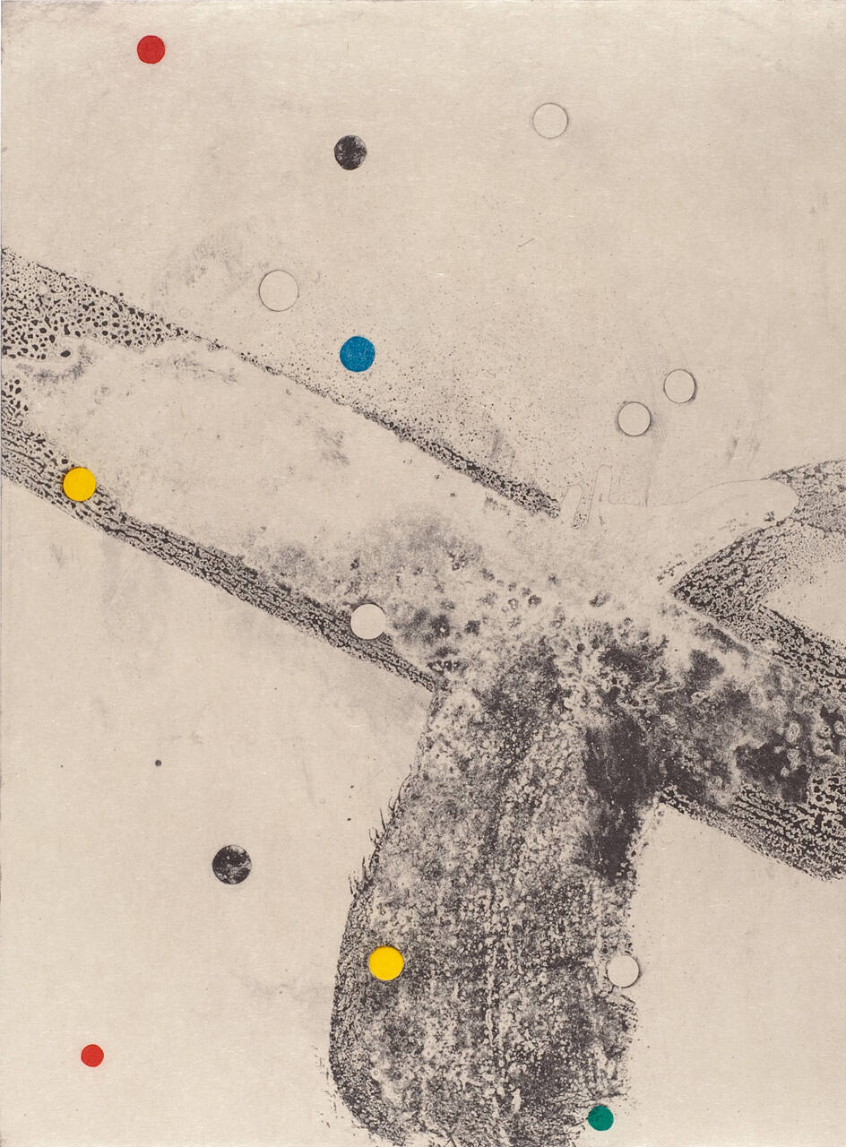 DescriptionEM 2 is made up of two gestural strokes which intersect to form an abstract X configuration in the center right of the composition. Colored dots-red, blue, yellow, black and green are distributed over the surface.Copyright© Estate of Ed Moses / Michael Kohn Gallery, Los Angeles