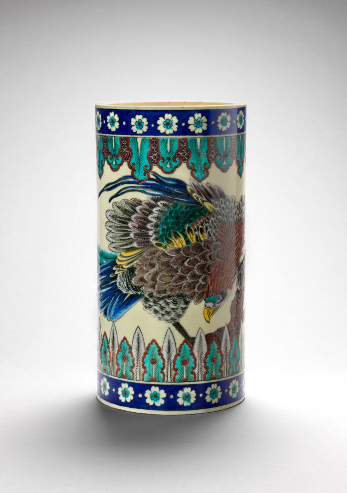 DescriptionCylindrical earthenware decorated with large black-outline eagle or mythological raptor highlighted with enamel colors in red, blue, teal and yellow with bands of stylized feathers.Gallery LabelThéodore Deck, innovator in French ceramics during the mid-19th century, used the vivid coloring of Islamic ceramics in this design of a mythological eagle ready for attack. Known for his Islamic-inspired vibrant blue glazes, Deck experimented with numerous artistic styles. This colorful bird is based on Chinese examples popular in France in this period. Deck exhibited at most of the world’s fairs from 1871 to 1889, garnering numerous medals.