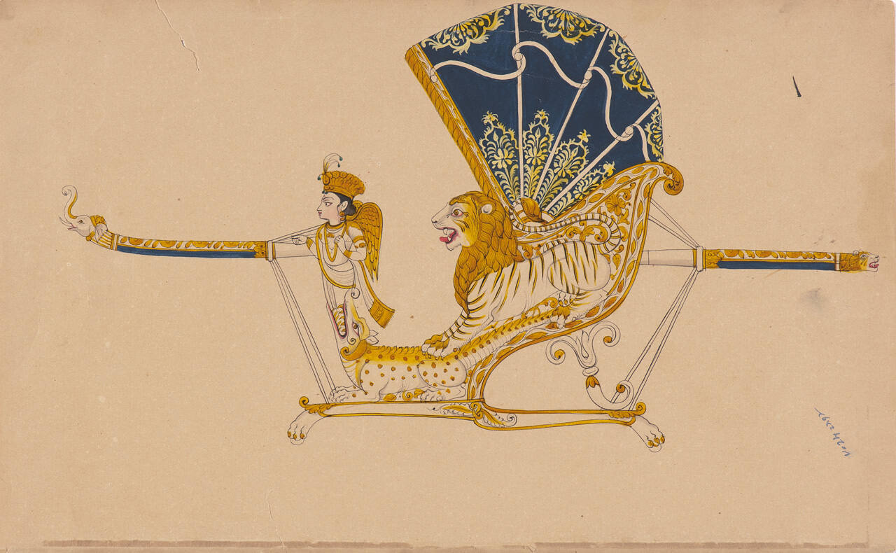 Design for a Blue-Hooded Tonjon Palanquin with a Lion attacking and Elephant from an Indian Workshop