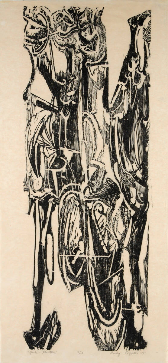 DescriptionIndeterminate erect avian form wtih leg, wing, and tail appendages.Copyright© Estate of Rudolph "Rudy" Otto Pozzatti