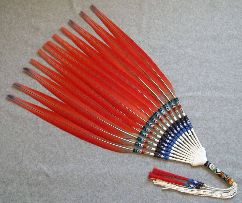 DescriptionFeather fan comprised of 12 long, red Macaw feathers the shaft of each ornametnted with featherwork and the shaft of each all terminating towards a white, buckskin covered and beaded handle with fringe extending from the bottom. Bead work depiction of tipi, waterbird, and Talking God Navajo Image in night skyPublished ReferencesTorrence, Gaylord, ed. Continuum: North American Native Art at the Nelson-Atkins Museum of Art. Kansas City: Nelson-Atkins Museum of Art.