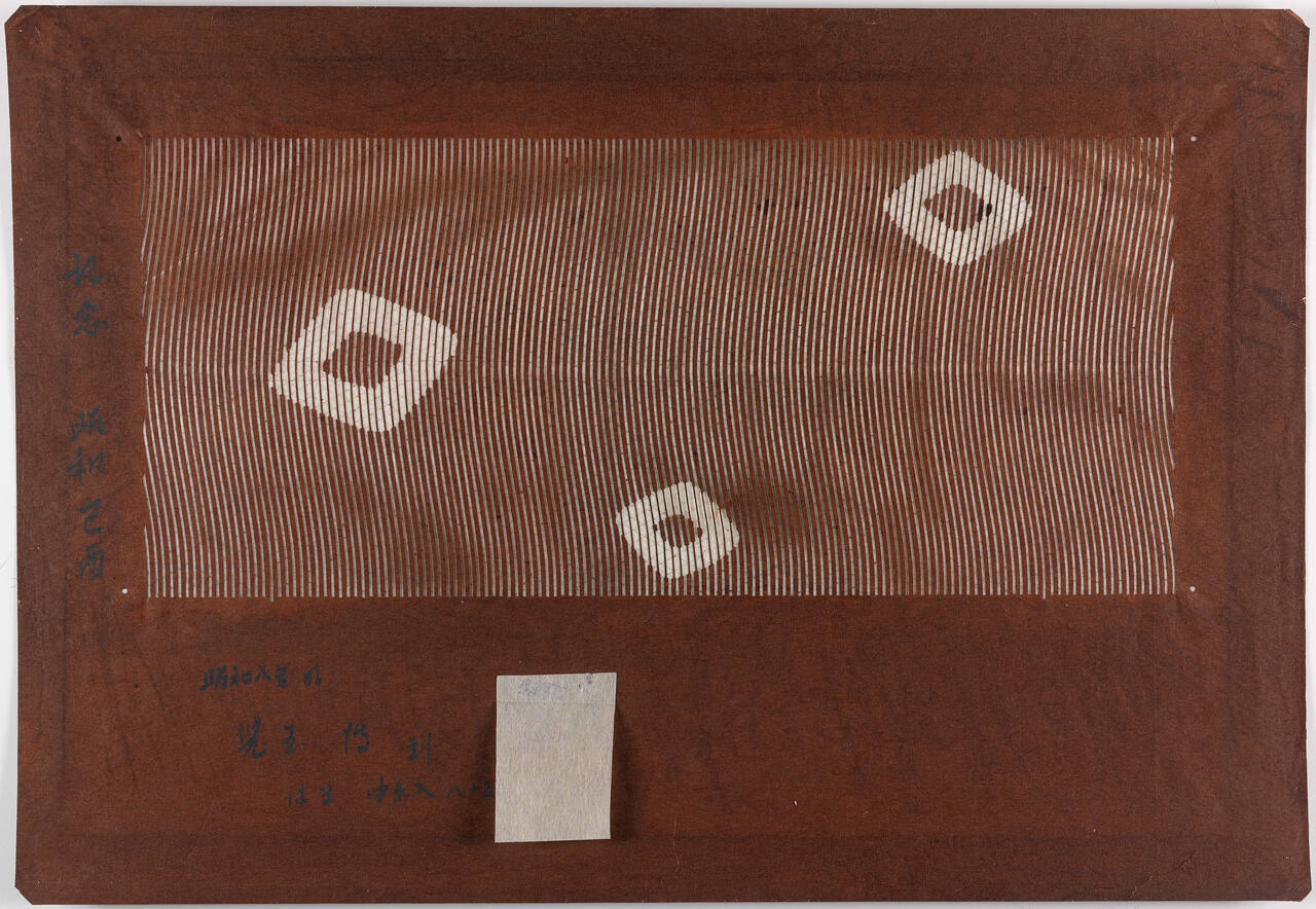 This stencil, carved by former Living National Treasures of Japan, represents a significant aspect of Japanese textile tradition. Stencil-dyeing became popular after other, luxurious techniques were restricted by the government in the 17th century. Here, the sheet of stencil contains several layers of mulberry paper laminated with persimmon juice, which dyed the paper into a dark brown, strengthened it and made it water resistant. When used, the dyes went through the carved geometric, floral or faunal openwork onto fabrics.
