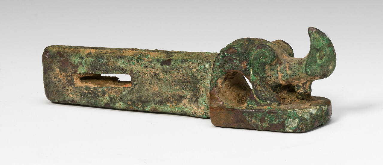 DescriptionOne of a pair of complete linchpins. Top ornamented with hook-beaked bird in full relief.