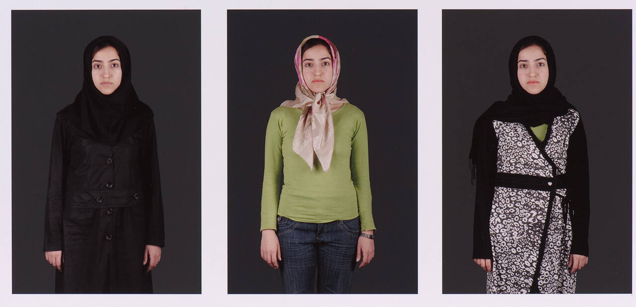 DescriptionTriptych of woman dressed in three different outfits: first, in black with head covered; second, in green sweater and jeans with head covered; and third, in black and white with head covered.Copyright© Gohar Dashti