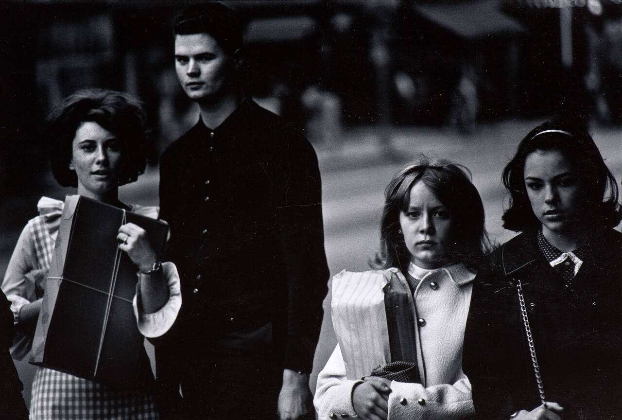 DescriptionThree young women and one young man walking down city street. Two of the women are carrying packages.ProvenanceHall Family Foundation, Kansas City, MO, 2011;