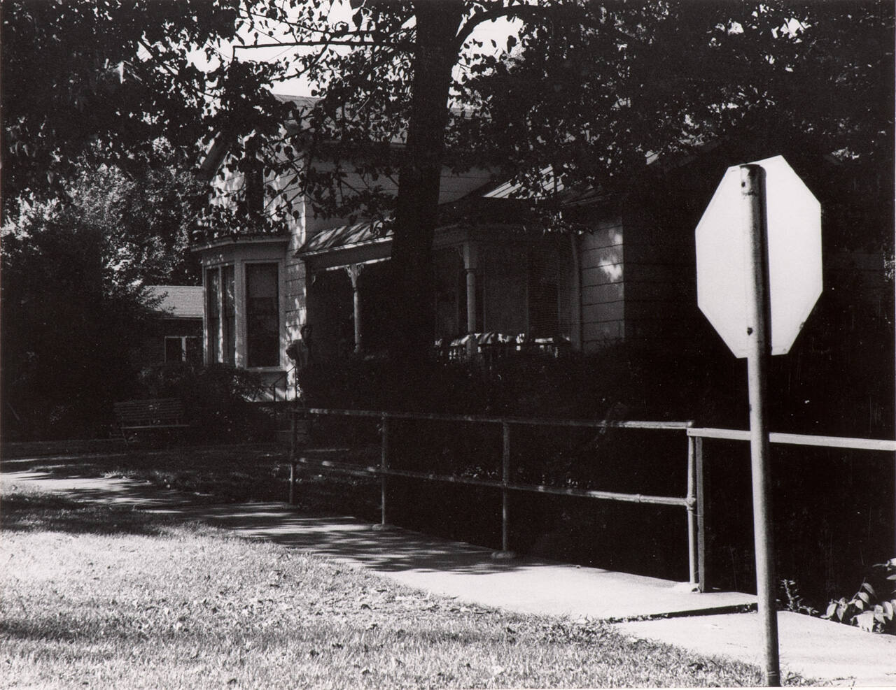 DescriptionImage of a house surrounded by shade trees with a stop sign along the right edge of the frame. One of fourteen photographs included in an album made by the artist.Copyright© Charles Swedlund