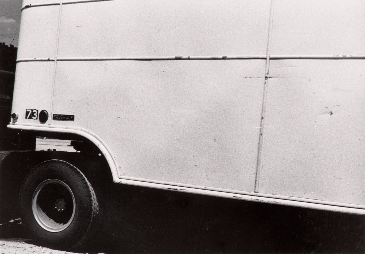 DescriptionImage of a white trailer with the back left tire visible; the number "73" is on the vehicle above the wheel. One of fourteen photographs included in an album made by the artist.Copyright© Charles Swedlund
