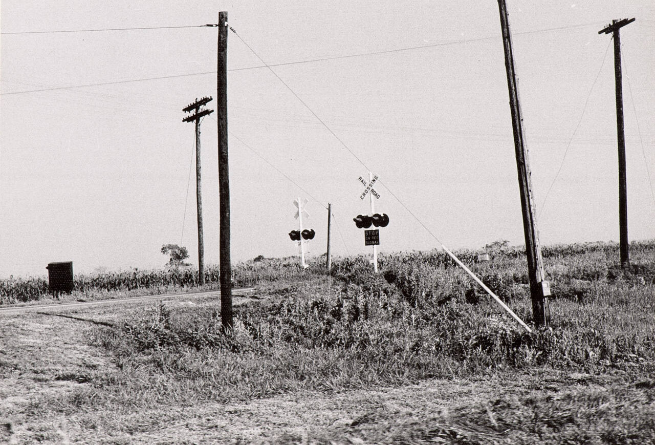DescriptionImage of a railroad crossing with intersecting telephone lines. One of fourteen photographs included in an album made by the artist.Copyright© Charles Swedlund