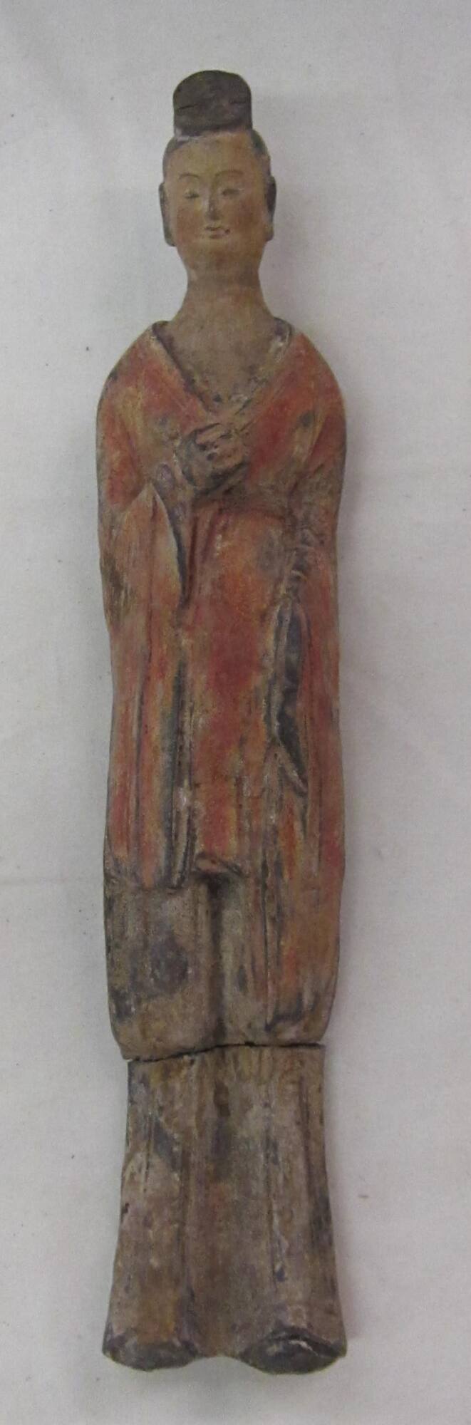DescriptionThis terracotta tomb attendant is a slendarized male figure dressed in a red-colored robe. the front chest as though he was holding something in his hand originally or is perhaps holding something small.