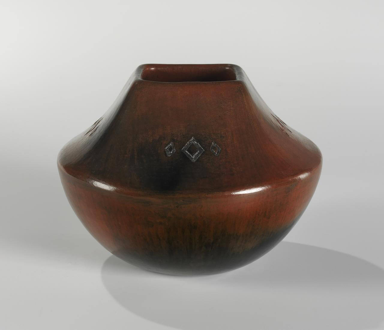 DescriptionSmall, dark red (gradating to black color near the bottom edge), circular, ceramic jar tapering to a square mouth opening above the shoulder with three incised diamond shapes on each of the sides.