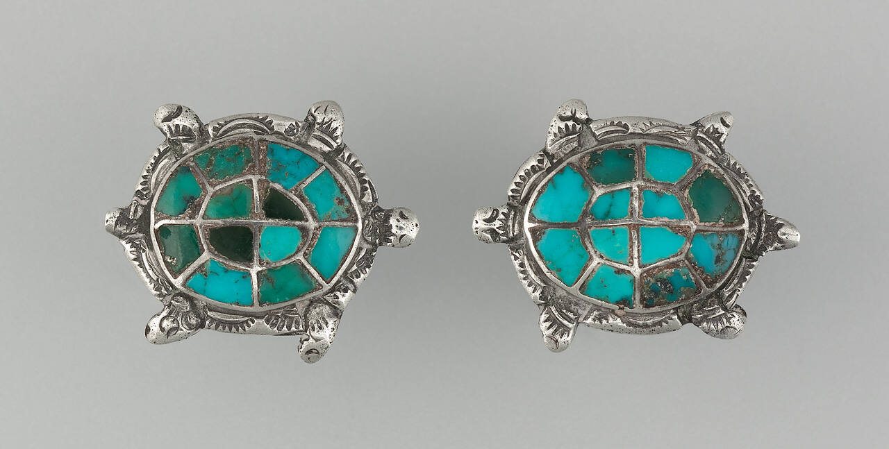 DescriptionPair of earrings depicting turtles; each set with 12 pieces of turquoise inlaid in silver channels and stamped designs.CopyrightThis work is copyrighted. Contact the copyright holder for permission to reproduce.