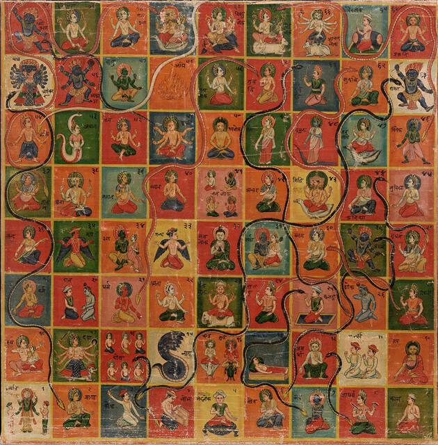DescriptionThe painting is square in format and depicts a grid of 72 squares, painted in red, pink, blue, green, orange or yellow. A different Hindu or Buddhist deity is rendered in polychrome in each square, identified by inscriptions. Dark grey, red, and tan swirling snake forms connect various cells.Exhibition HistoryNo exhibition history known at this time.