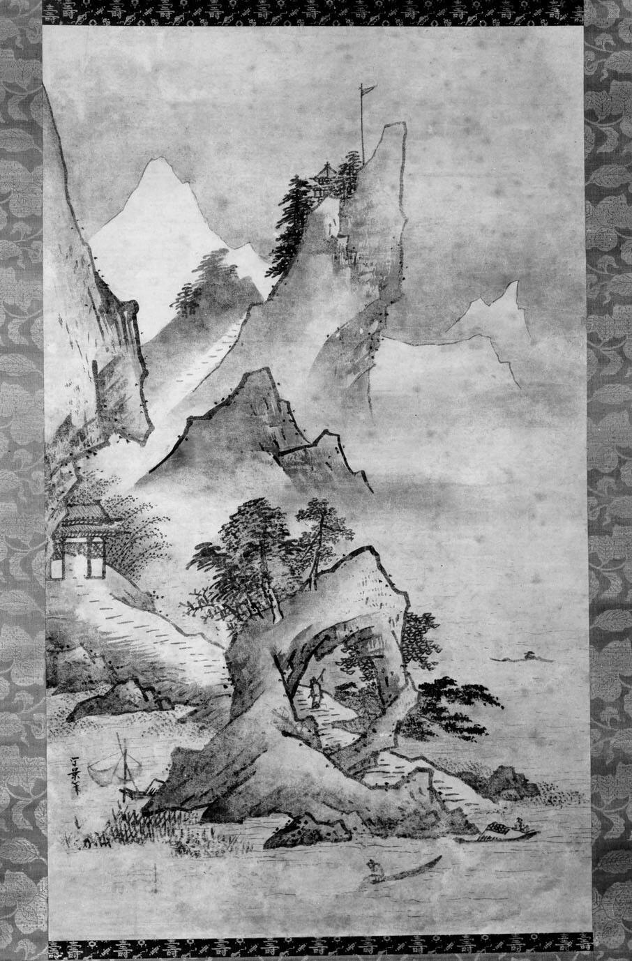 DescriptionAngular, lithic mountain fragments composed in a large, single zig-zag occupy left two-thirds of picture. Right is open, beginning with a fore- and middle-ground expanse of water that gives way to a wall of distant mist. Outline brush stroke is rather broad and soft, given the intent to depict angular forms; light and dark washes lend a dramatic activity to the composition.ProvenanceMakita Tamaki, Tokyo [1];