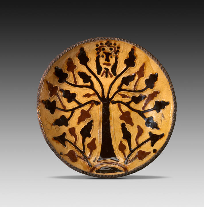 DescriptionA moulded slipware dish by Samuel Malkin, decorated in light and dark brown slip on a pale ground with the head of Charles II in a formal oak tree, flanked by the moulded initials S.M. perhaps Jacobite.Gallery Label