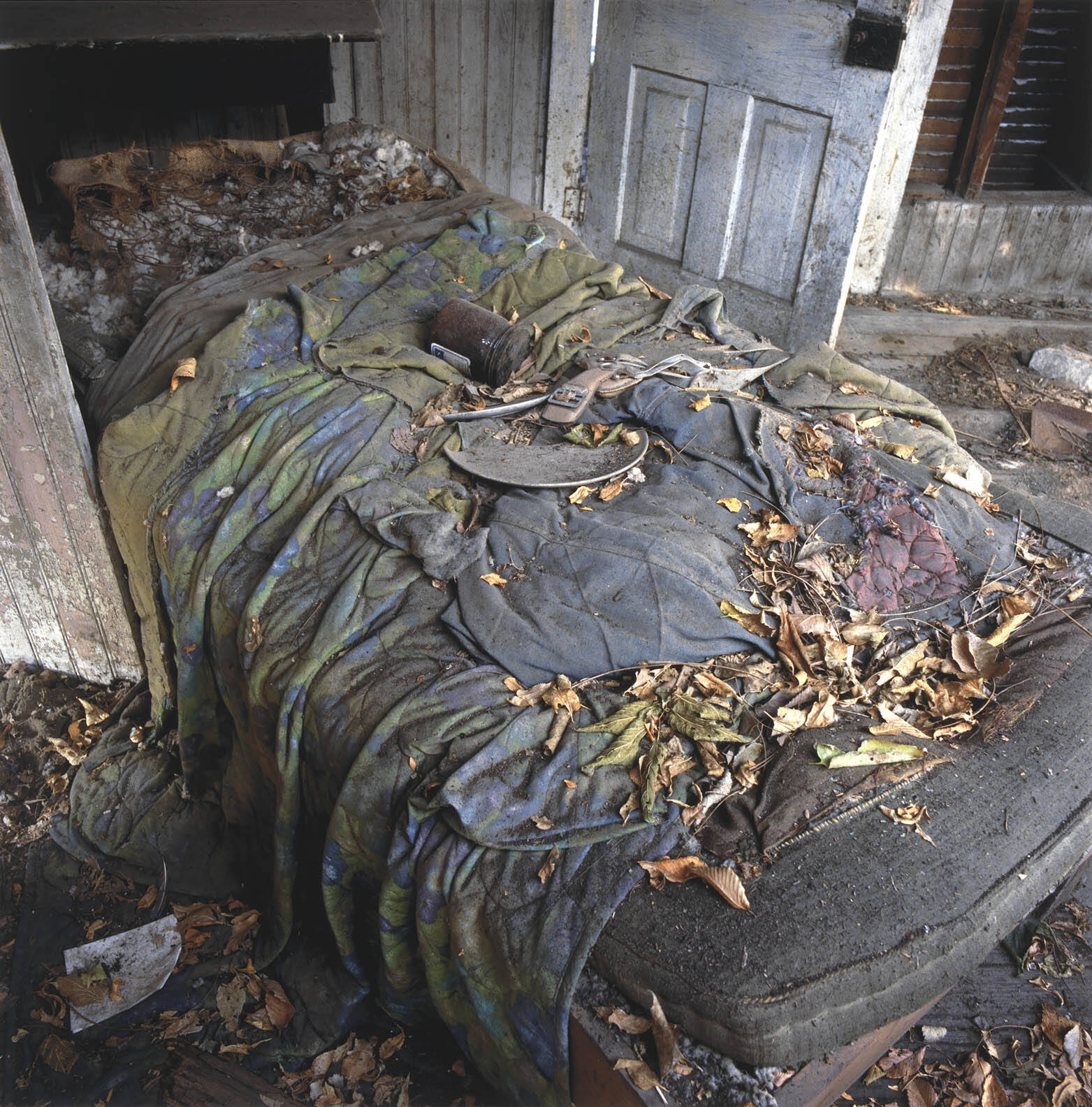 DescriptionImage of an old mattress and blankets covered with dirt, leaves and debris.Copyright© Terry Evans
