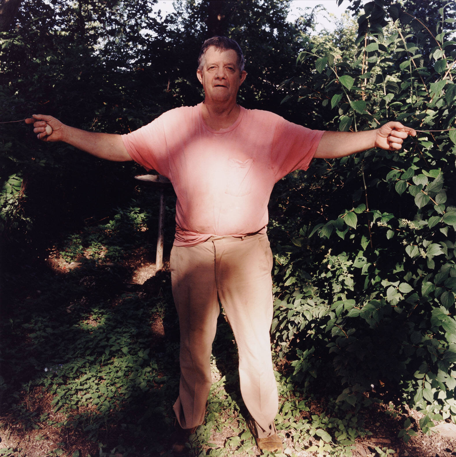 DescriptionImage of a man wearing khakis and t-shirt standing outside with arms outstretched.Copyright© Terry Evans