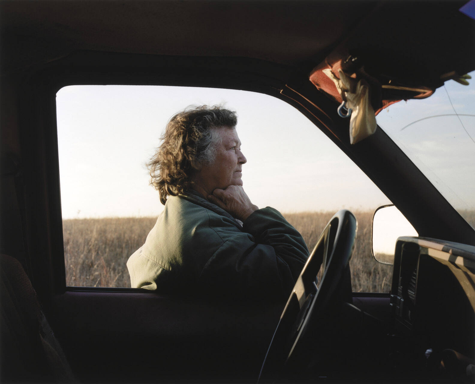 DescriptionProfile image of a woman wearing denim shirt and standing outside of a vehicle with arm resting on the open window; fields visible behind.Copyright© Terry Evans