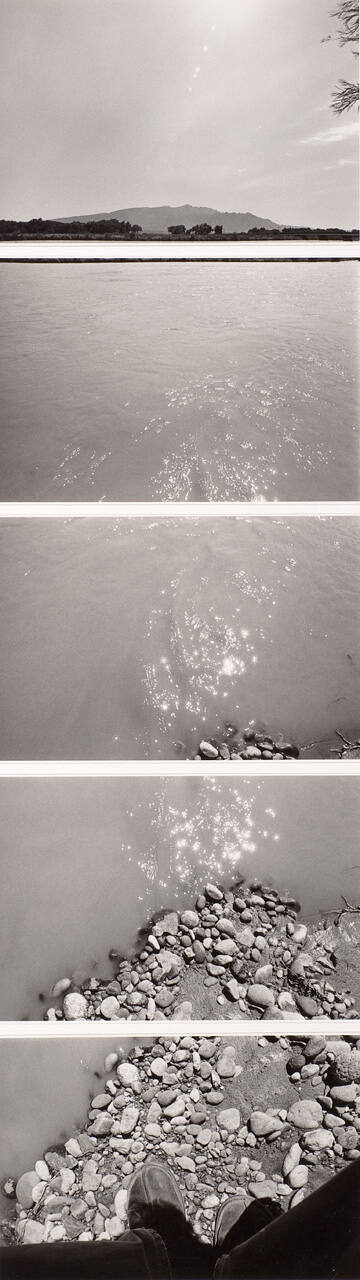 DescriptionFive photographs mounted vertically - each depicting a body of water with increased detail. The top image is the widest view of the landscape showing sky with a small section of land and water below; the bottom image is the most detailed and is of man standing on pebbles with only shoes and a small corner of the water visible.Gallery LabelFlying B-17 bombers during the Second World War transformed John Wood’s way of seeing the world—in this case, the Rio Grande, a river that forms part of the border between Mexico and the United States.