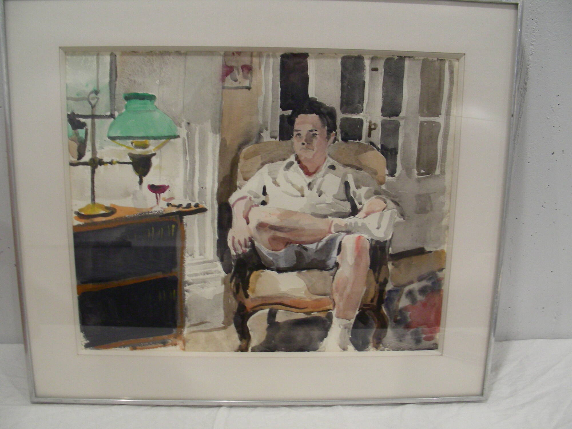 DescriptionA man wearing white shorts and a white shirt sits with his legs crossed in front of a window. At the left edge of the composition, the artist has included a black chest with a green lamp resting on it. A glass (of red wine?) is adjacent to the lamp.