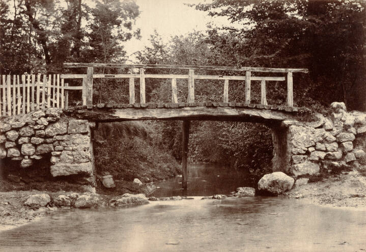 DescriptionImage of a simply constructed wooden bridge over shallow water with surrounding trees.