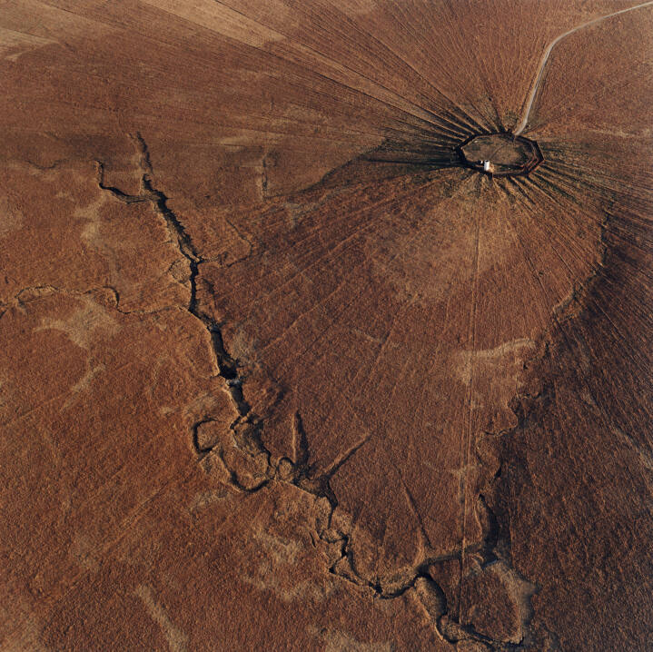 DescriptionAerial landscape composed of ray-like impressions that emanate from a small circular area of land; a deep crevice separates the land below.Copyright© Terry Evans