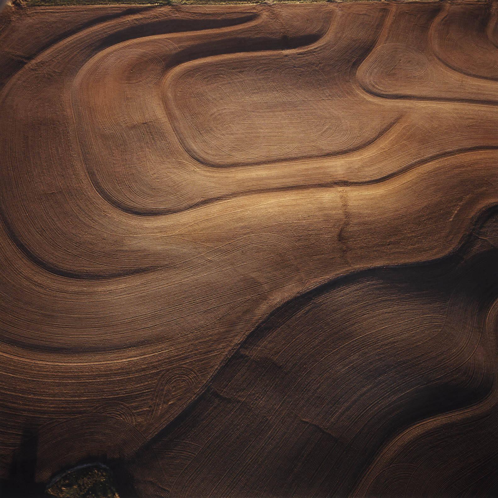 DescriptionAerial image of land with plow marks in large U-shape formations of decreasing sizes.Copyright© Terry Evans