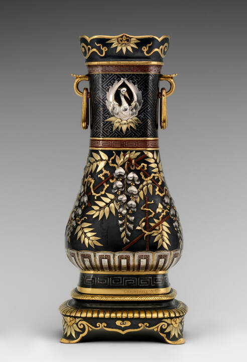 This vase represents a dynamic fusion of Asian and European styles. Evoking an ancient Chinese form, the vessel combines motifs such as Middle Eastern phoenixes, classical Greek key patterns, and Renaissance and Baroque designs. The vibrant metallic colors recall Japanese mixed-metal and lacquer work. These effects were achieved through an innovative electroplating process.