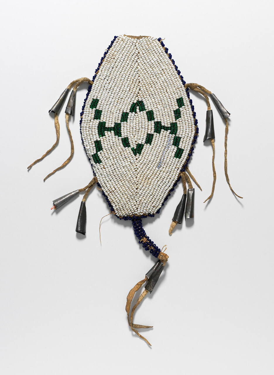 DescriptionWhite beaded leather form in the shape of a diamond with the ends cut off, a green beaded abstract design at the center and edged with a single strand of blue beads, four pairs of danglers each terminating in a tinkler and remains of feather shafts.