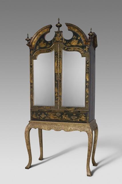 If imitation is the sincerest form of flattery, this English cabinet is a love letter to East Asian lacquered furniture. In the early 1700s, imported East Asian objects were popular and expensive in England. In response, English cabinetmakers developed a technique they inaccurately call japanning, mixing a type of varnish with pigments to imitate true Asian lacquer, hardened tree sap that protects and decorates furniture. Decorated with motifs borrowed from Chinese and Japanese furniture and porcelain, objects like this cabinet offered eager European customers the ability to have fashionable furniture at a more affordable—bur still very elite—price point.