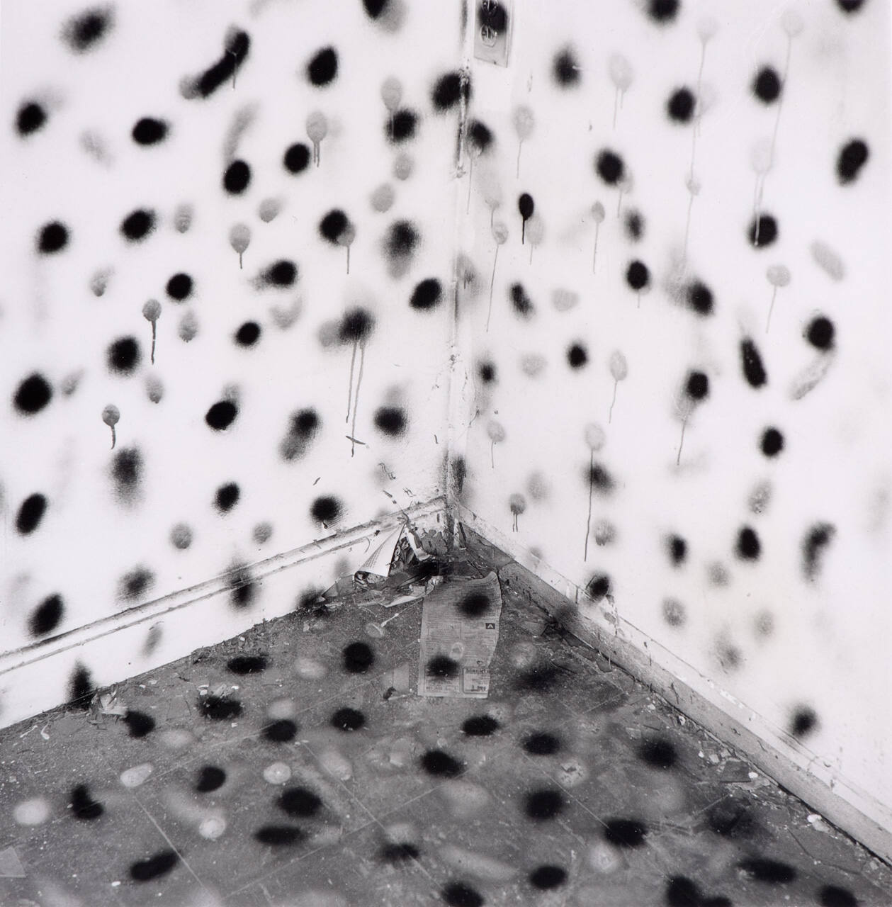 DescriptionImage of the corner of a room with large dots spray painted on walls and floor.Gallery LabelIn his series Vandalism, John Divola explores the idea that photographs can function simultaneously as evidence and artifice. Defying conventional documentary standards to record subjects as they are found, Divola photographed derelict sites after moving objects and marking spaces with spray paint. These transformations, once photographed, obscure spatial depth and light sources, confusing our understanding of these interiors.