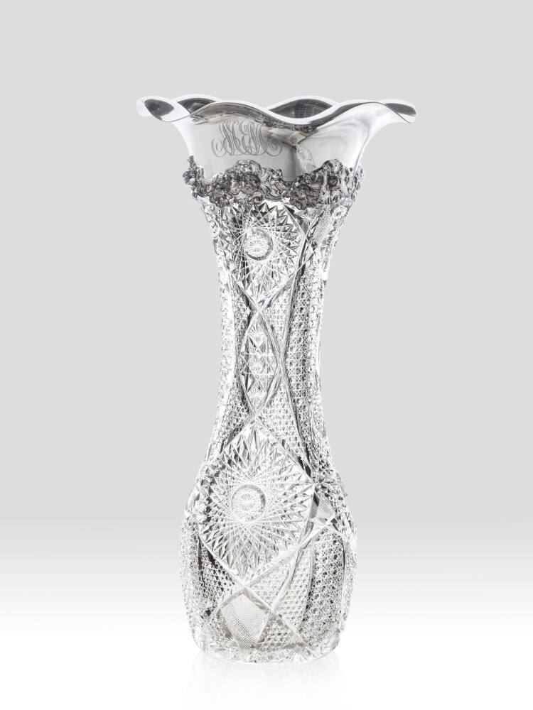 DescriptionElongated baluster shaped vase with sterling silver collar. Cut glass pattern motifs include multiple large hobstars, strawberry diamonds and smaller hobstars. The silver collar has an undulating rim, with chased silver flowers and a large monogram. Gorham makers marks.ProvenanceCollection of Herb Adler (1929-2013), Shawnee Mission, KS;