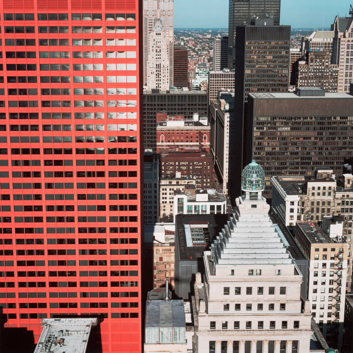 DescriptionAerial image composed of numerous buildings including a large salmon-colored one with many windows.Copyright© Terry Evans