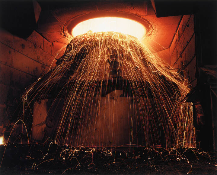 DescriptionImage of a furnace-like room with a circular opening producing thin strands of fiery slag.Copyright© Terry Evans