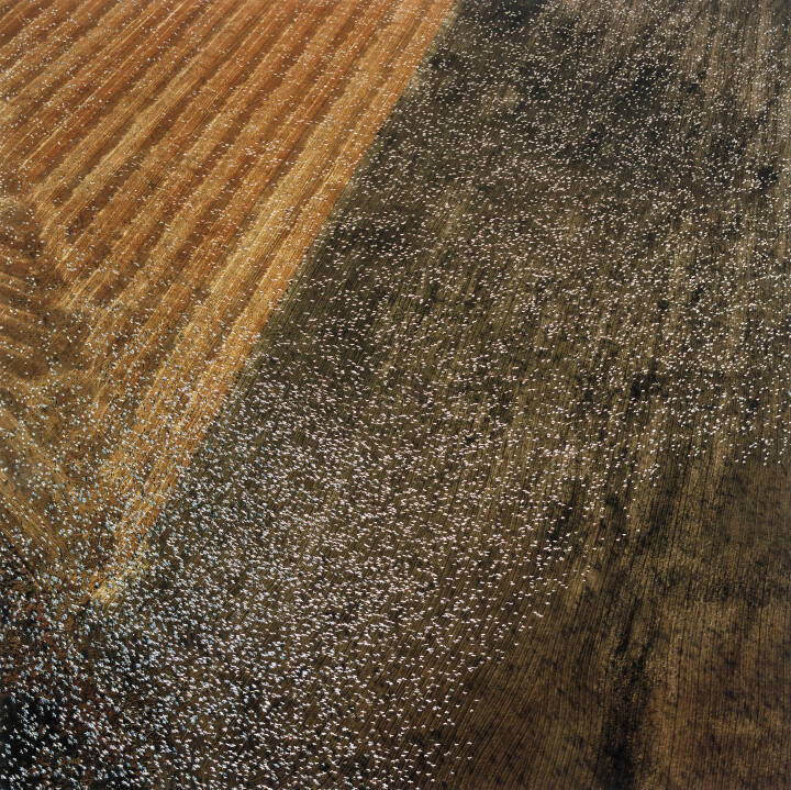 DescriptionAerial image of thousands of white birds flying over farmland.Copyright© Terry Evans