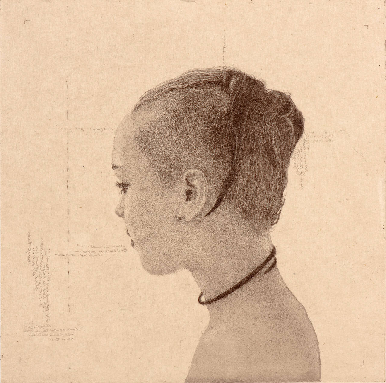 DescriptionSide view of young woman from shoulders up, hair up, black necklace, earring in left ear. (The writing in the background is a wonderful story about baseball that I was listening to at the time.)Copyright© Carol Mothner