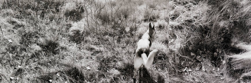 DescriptionPanoramic image of a dog moving among arid landscape of tall grasses and small branches.Copyright© Terry Evans
