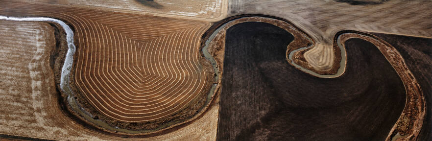 DescriptionAerial image of a narrow, winding river traveling through flat terrain in various shades of brown.Copyright© Terry Evans