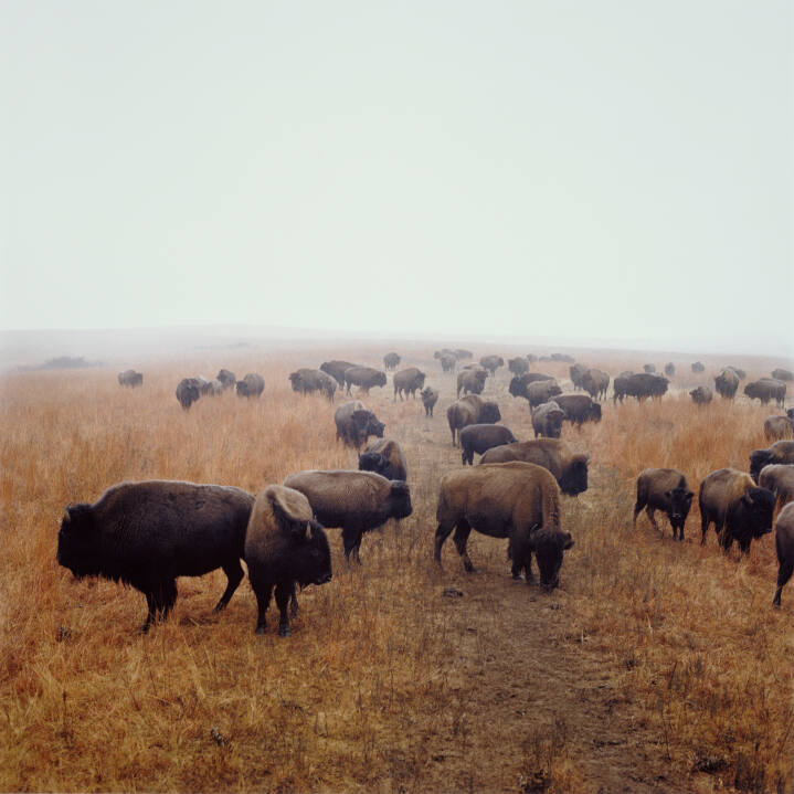 DescriptionImage of a herd of bison grazing in field with fog-covered horizon in background.Copyright© Terry Evans