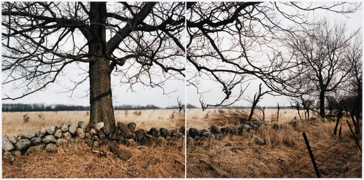 DescriptionTwo panel panoramic image of a large tree and fence built from round stones.Copyright© Terry Evans