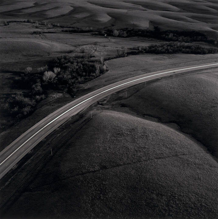 DescriptionAerial image of a narrow highway running through the center of a landscape with rolling hills and small trees.Copyright© Terry Evans