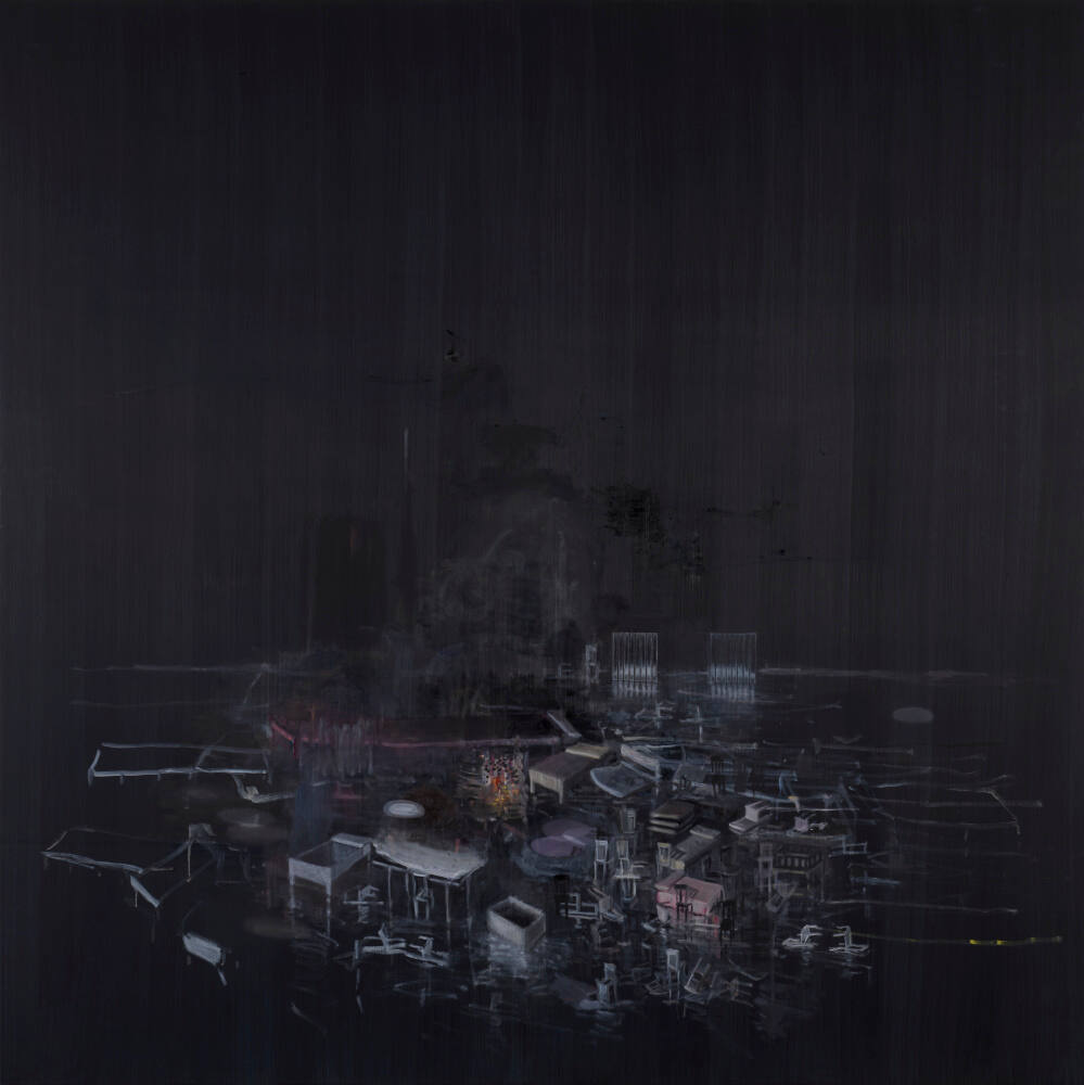 Chairs overturned, tables and beds askew, flames licking the darkness, a smoky haze rising—and all of it still and silent, reflected in black water. What has happened here? The artist does not answer that question. Instead, he invites each of us to imagine the pain of disaster and dislocation together with the strange and haunting beauty of the calm that follows.