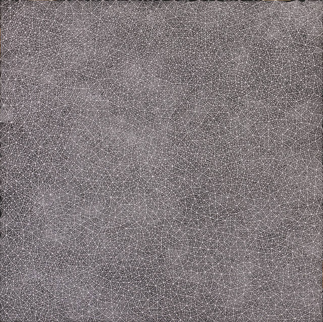 DescriptionThis complex abstract print is made of a fine network of straight white lines connected to each other by points on a black ground.Gallery LabelTo see a world in a grain of sand,